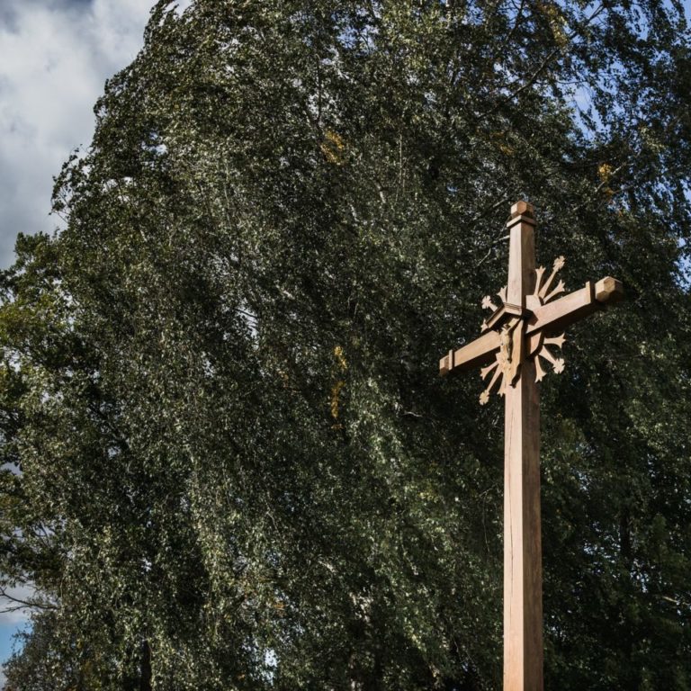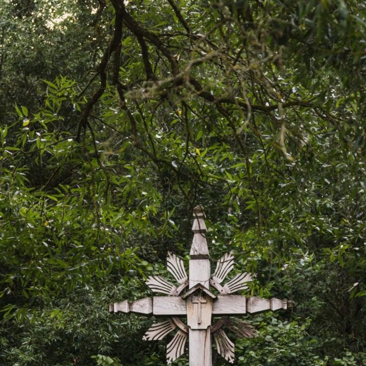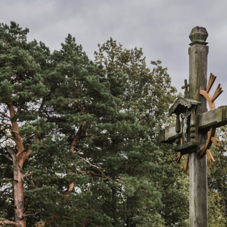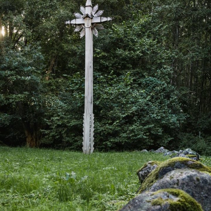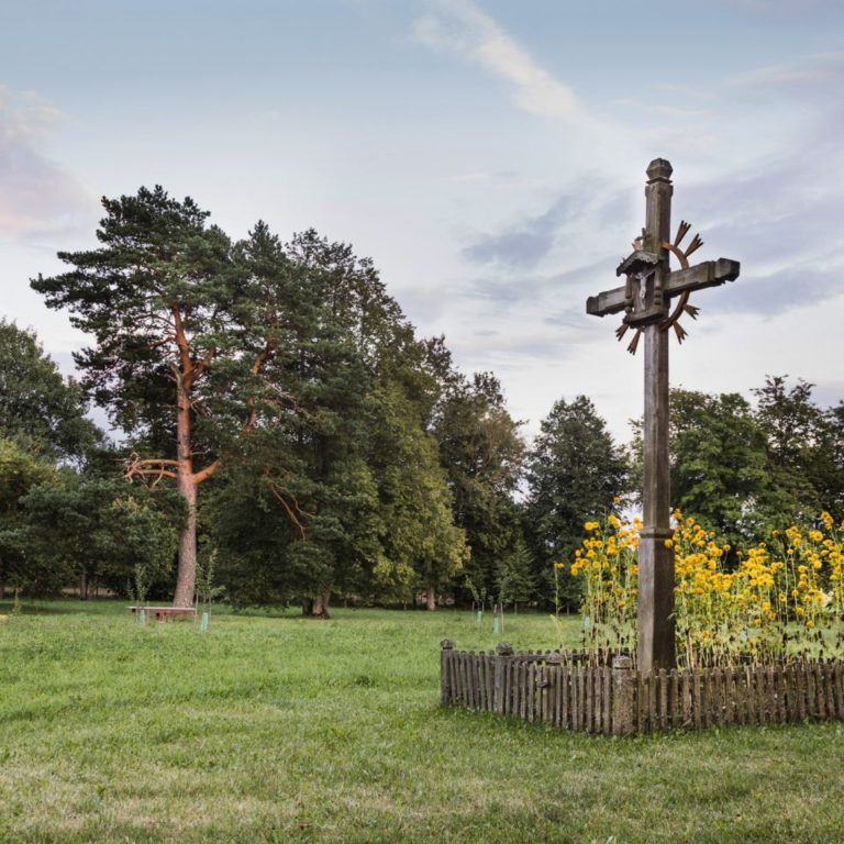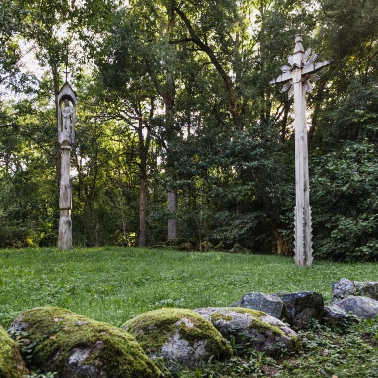 Raimundas Puškoris‘ double-sided pillar-type chapel ‘Jesus of Nazareth and Mary Mother of Jesus, Our Lady of Sorrows’ is built in the small graveyard. In the statuettes of Jesus of Nazareth, Christ is depicted in long robes, with a crown of thorns placed upon his head, and with his arms crossed on the chest, secured with ropes. On the other side of the pillar-type chapel, there is a sculpture of Mother of Jesus, Lady of Sorrows. Standing at the foot of her son’s cross, she is mourning at the Crucifixion of her singleton, and profoundly empathising with the suffering of Jesus Sacrifice. Mary, the doleful Mother is depicted in black with seven swords piercing her heart. These seven swords symbolize the chief seven sorrows of Our Lady’s life. The first sorrow is related to the prophecy of Simeon: ‘This child is destined to cause many in Israel to fall, and many others to rise. He has been sent as a sign from God, but many will oppose him. As a result, the deepest thoughts of many hearts will be revealed. And a sword will pierce your very soul.’(Luke 2:34). The second sword of sorrow is The Flight into Egypt. The third sorrow is related to the loss of the Child Jesus in the Temple of Jerusalem. The fourth sword of sorrow relates to Mary meeting Jesus on His Way to the Cross. The fifth sorrow refers to Mary standing at the foot of the cross. The sixth sword of sorrow relates to the taking down of the Body of Jesus from the Cross. The seventh sorrow is related to Jesus Laid in the Tomb.