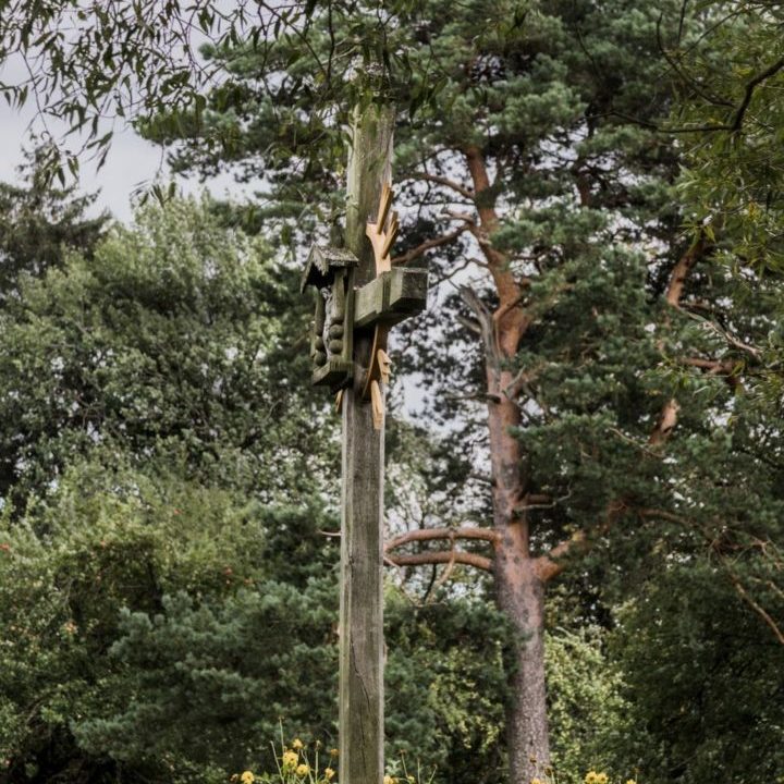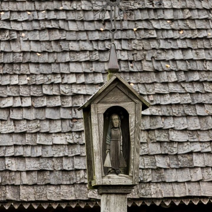 Traditionally, a cross is carved with the figure of crucified Jesus Christ, stripped of all his clothing and suffering, with his head covered with a crown of thorns. The structure of the cross décor is characterised by profiled ends, featuring a nimbus in the centre, and distinctive elements of rays in every quarter. The Calvary is covered by a small wooden roof.