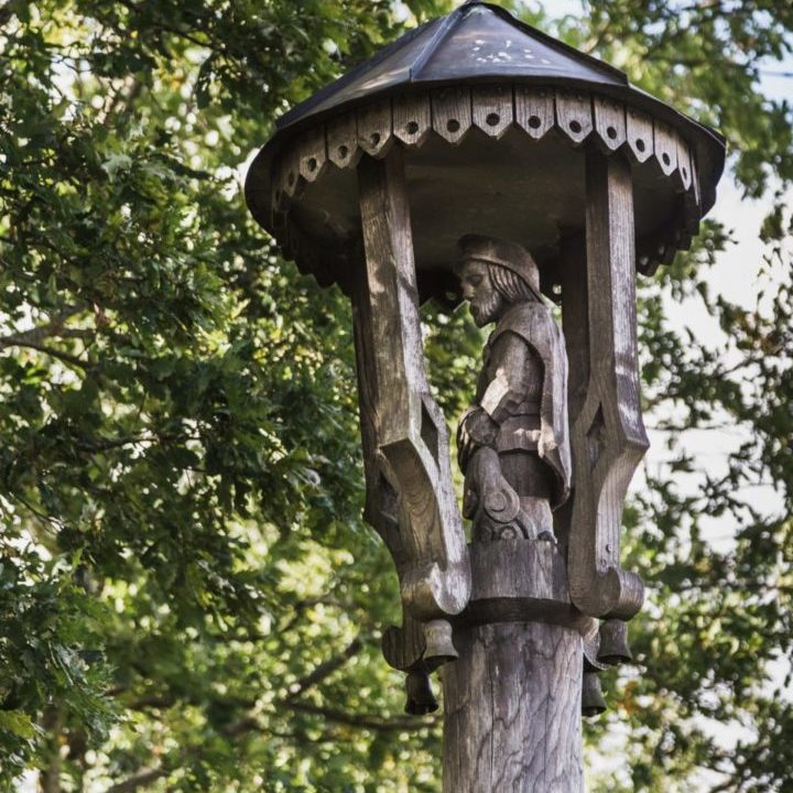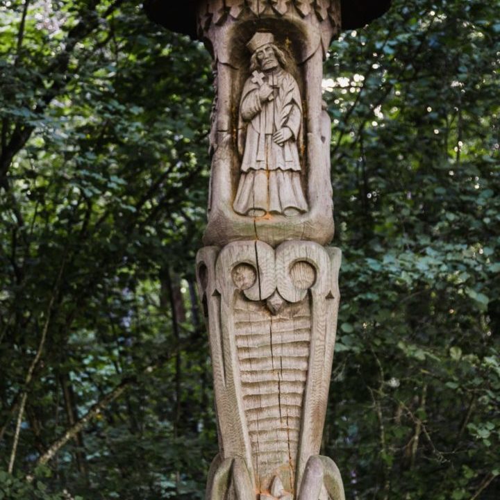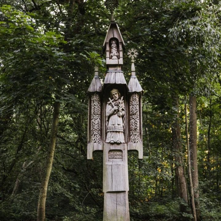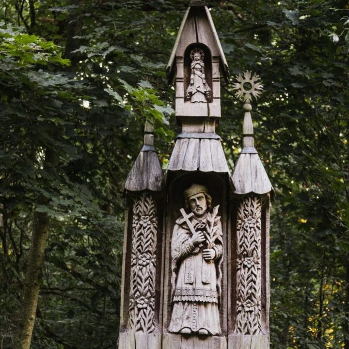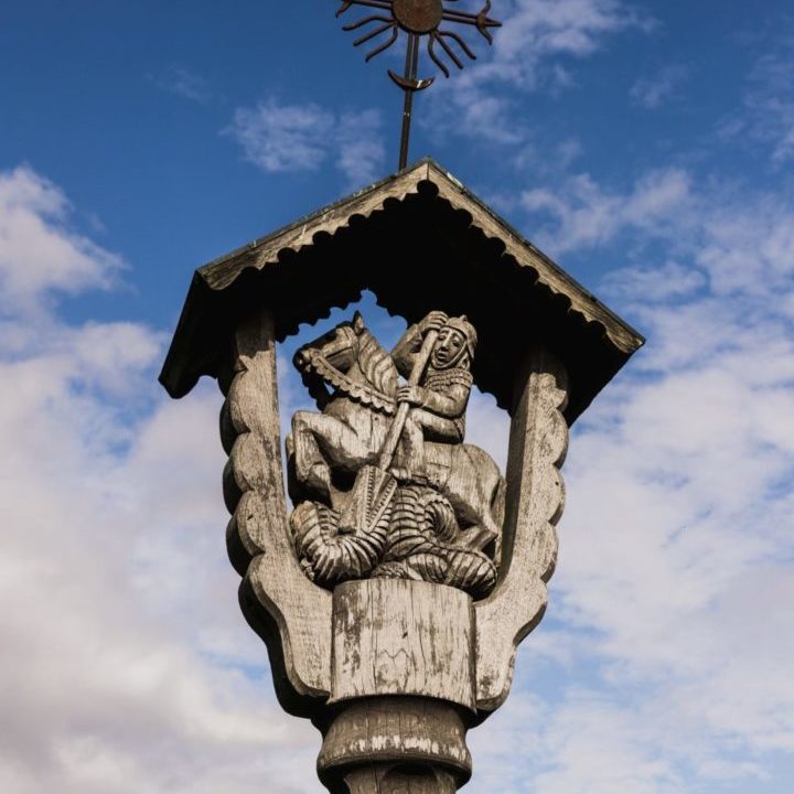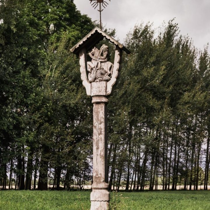 In Lithuania, Saint George is the second most important patron saint, after Saint Casimir, and he is also the patron saint of farmers, soldiers, and scouts. Saint George is depicted riding a horse, often spearing a dragon, a symbol of good winning over evil. Saint John of Nepomuk is considered a patron saint of bridges, and a holy protector of fields and sowing, keeping them safe from floods. Saint John of Nepomuk is usually depicted dressed in a black cassock, symbolizing his priesthood. He is wearing a black four-winged hat called a biretta. In his right hand, he has a cross, and in his left hand, he is clutching a martyr’s palm branch. One more John’s attribute is a halo of five stars.