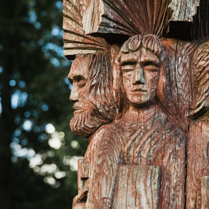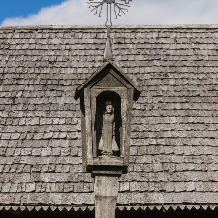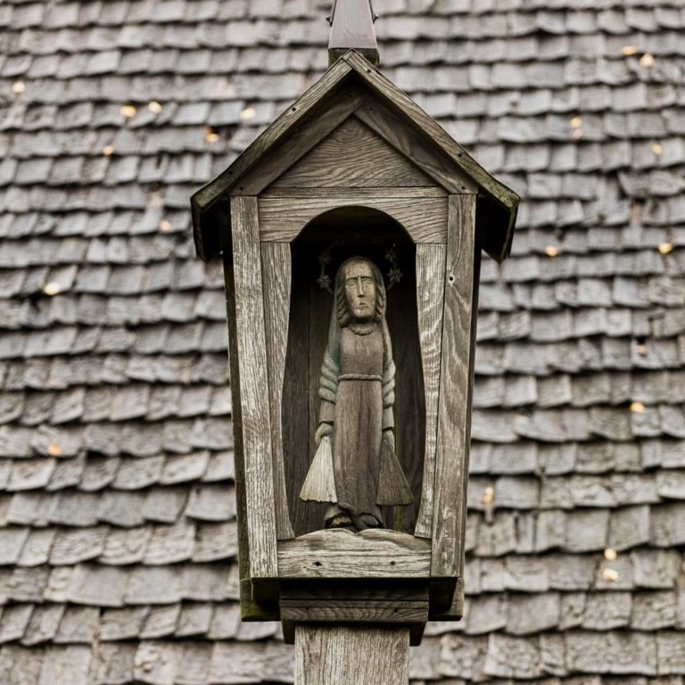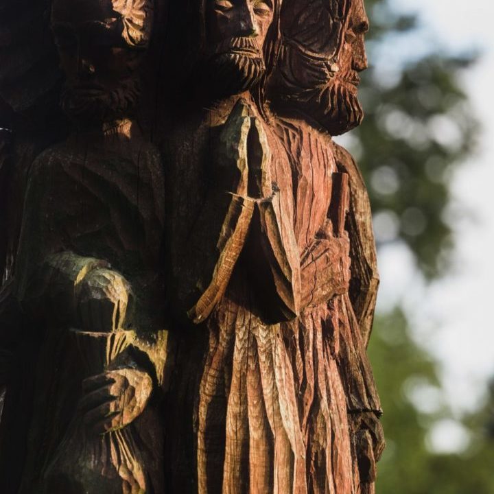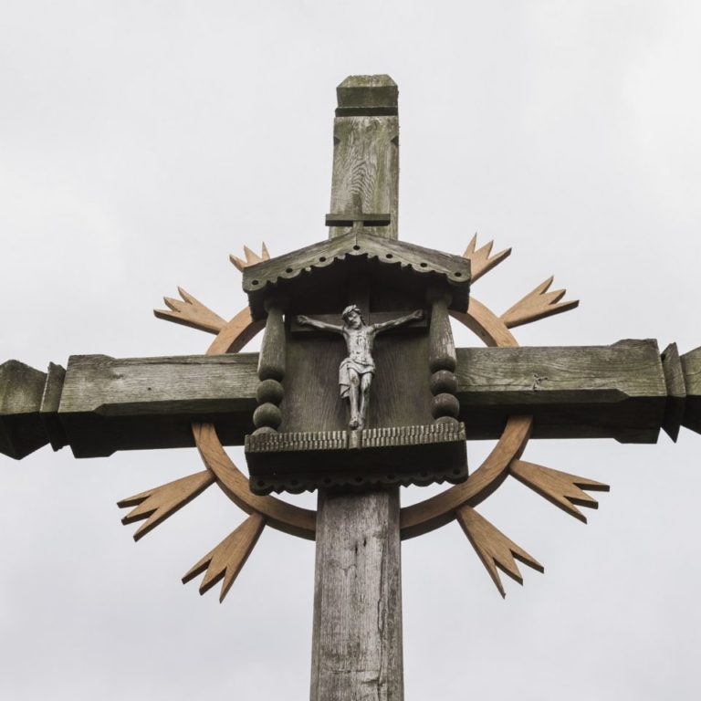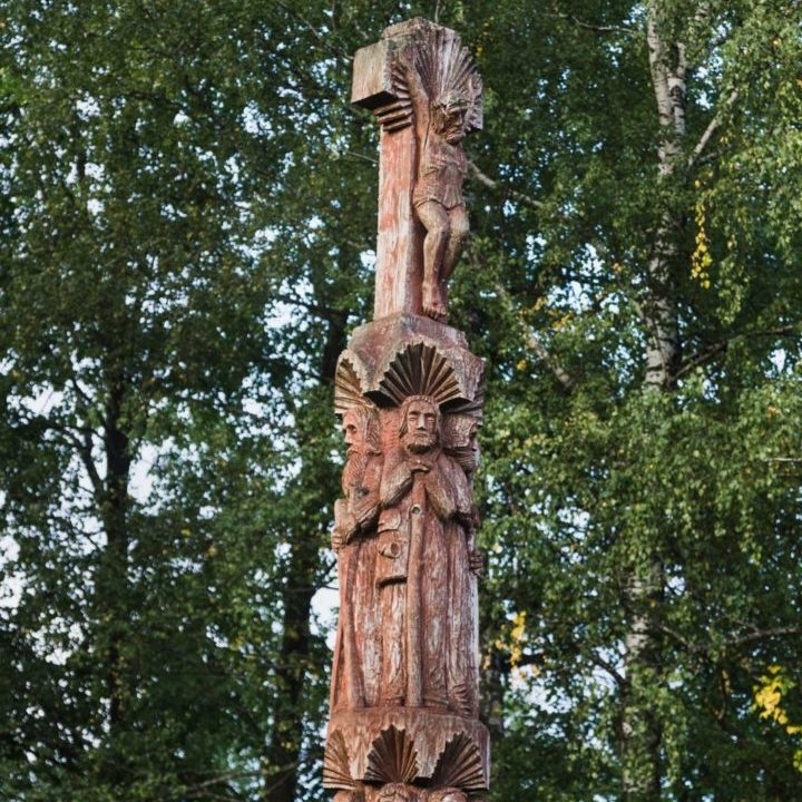 In Lithuania, Saint George is the second most important patron saint, after Saint Casimir, and he is also the patron saint of farmers, soldiers, and scouts. Saint George is depicted riding a horse, often spearing a dragon, a symbol of good winning over evil. Saint John of Nepomuk is considered a patron saint of bridges, and a holy protector of fields and sowing, keeping them safe from floods. Saint John of Nepomuk is usually depicted dressed in a black cassock, symbolizing his priesthood. He is wearing a black four-winged hat called a biretta. In his right hand, he has a cross, and in his left hand, he is clutching a martyr’s palm branch. One more John’s attribute is a halo of five stars.