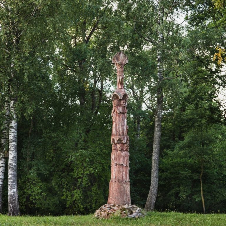 At the end of the birch tree alley, a unique four-sided roofed-pillar with images of Saint John of Nepomuk, Saint Casimir, Saint Cecilia, and Saint George is placed. It was crafted by Lithuanian godmakers S. Karanauskas and A. Jurkaitis. Saint Casimir is depicted dressed in royal clothing wearing the mitre of Grand Duke of Lithuania with a white lily and a cross symbolising both piety and chastity. Since the Middle Ages Saint Cecilia is considered to be a patron saint of music and is frequently depicted playing the small organ or Lithuanian plucked string musical instrument called Kanklės.