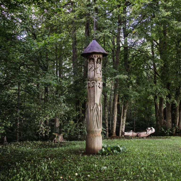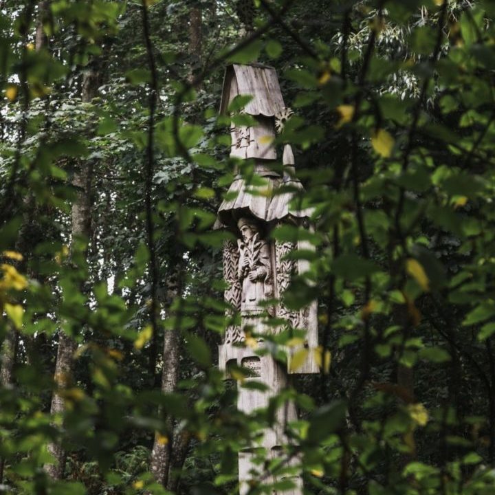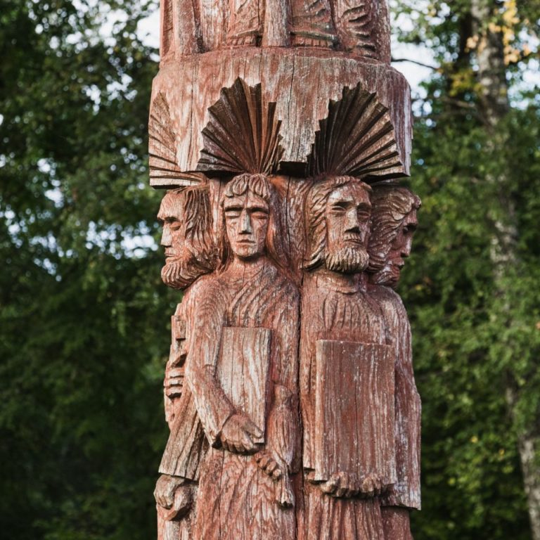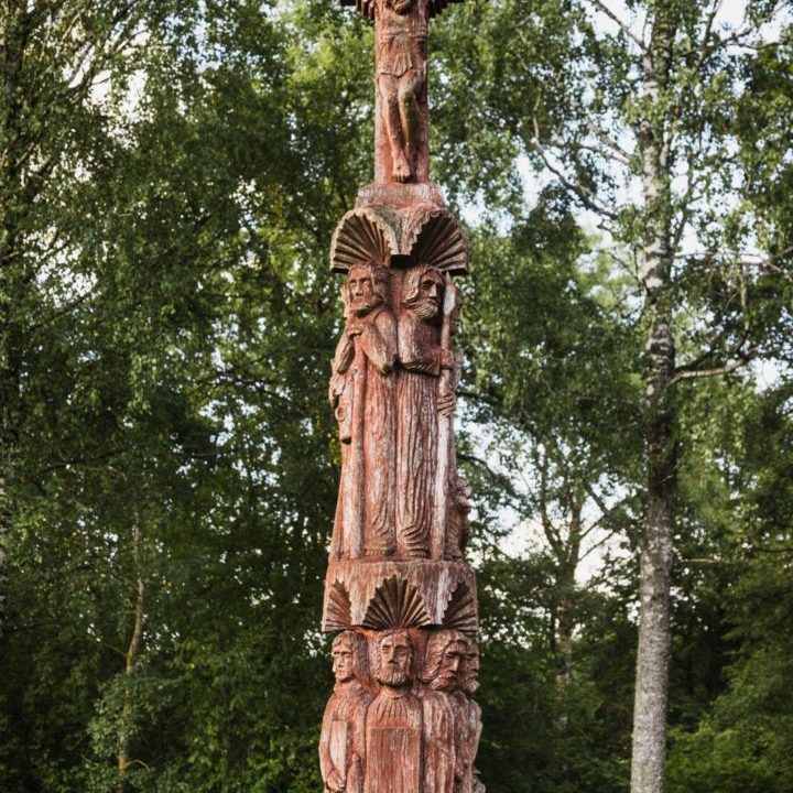 Lithuanian godmaker Aloyzas Urbšys‘roofed pillar ‘The Twelve Apostles’shows the way to the small graveyard. Twelve apostles, the disciples and closest followers of Jesus, are listed in the New Testament. The names of Jesus’ 12 main disciples were Peter, his brother Andrew, James son of Zebedee, John (James’ brother), Philip, Bartholomew, Thomas, Matthew, James son of Alphaeus, Jude (the apostle is also known as Jude of James), Simon the Zealot, and Judas Iscariot. When Judas Iscariot committed suicide, his place among the Twelve Apostles was later filled by Matthias. Later, Paul of Tarsus and Joseph Barsabbas were two candidates qualified to be chosen for the office of apostle.
