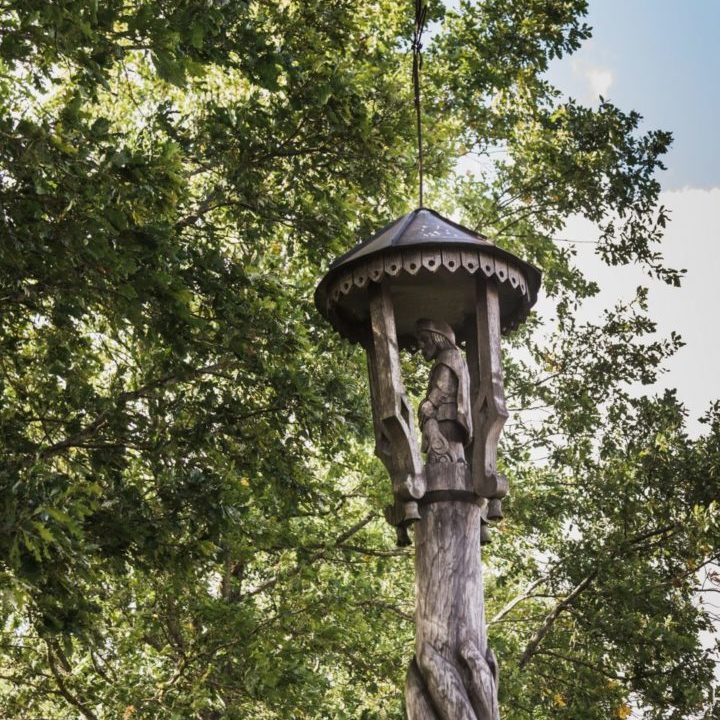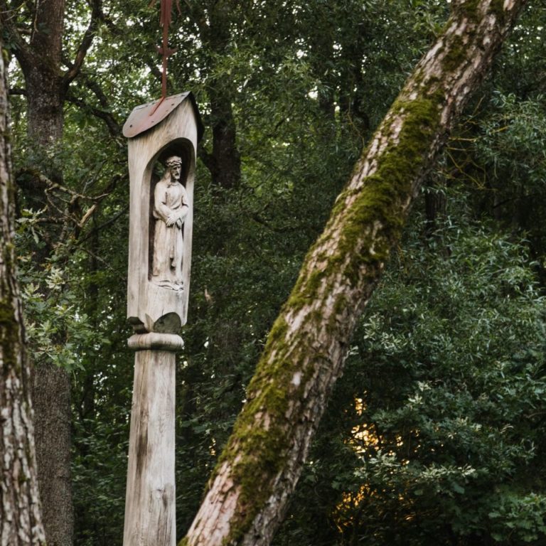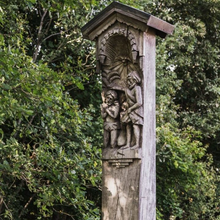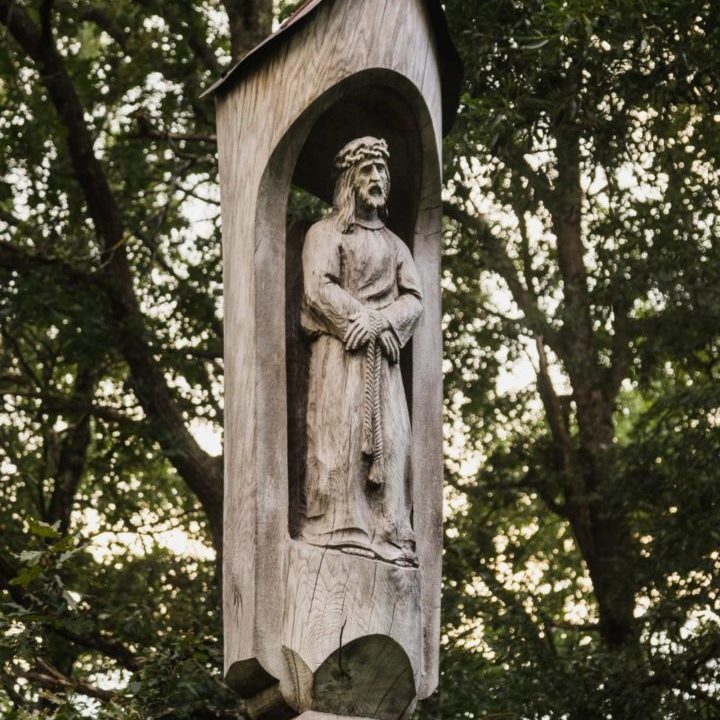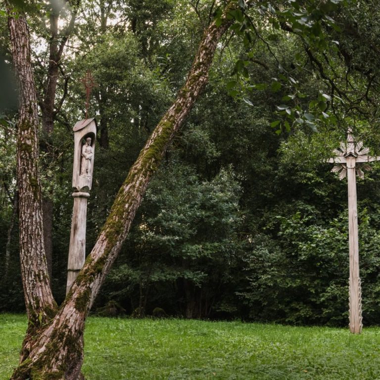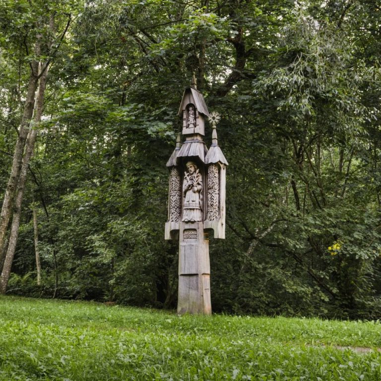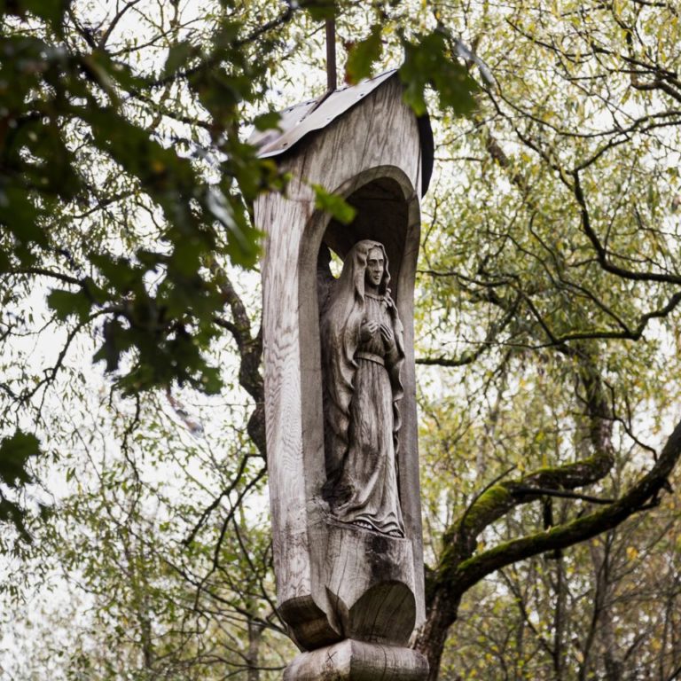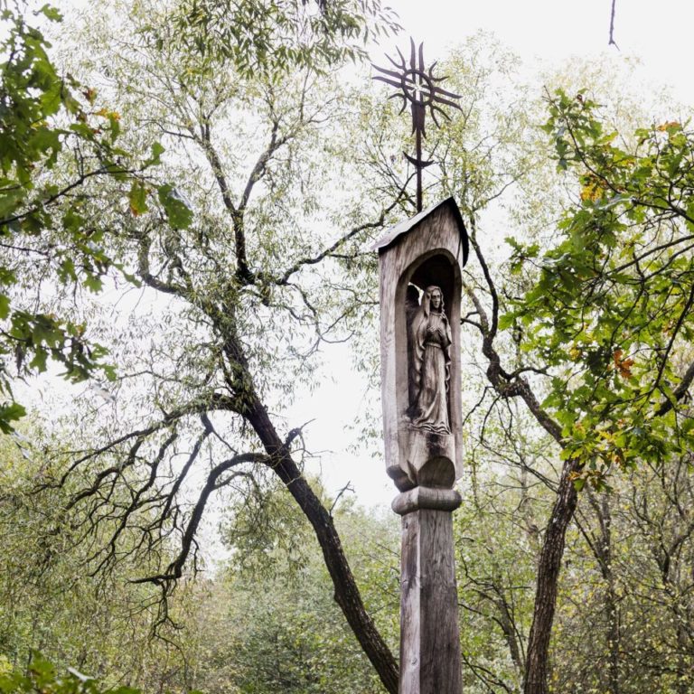 When one goes down to the valley of the Luknė rivulet, a visitor sees one more ‘Saint John of Nepomuk’ protecting a small bridge, and Maironis’ spring. The author of this elaborate pillar-type chapel is Jonas Tvardauskas. Saint John of Nepomuk is considered a patron saint of bridges, and a holy protector of fields and sowing, keeping them safe from floods. Saint John of Nepomuk is usually depicted dressed in a black cassock, symbolizing his priesthood. He is wearing a black four-winged hat called a biretta. In his right hand, he has a cross, and in his left hand, he is clutching a martyr’s palm branch. One more John’s attribute is a halo of five stars. Further, behind the main figure of Saint John of Nepomuk, as if in a separate small chapel, there is a small-sized statue of Mary, Our Lady of Grace.