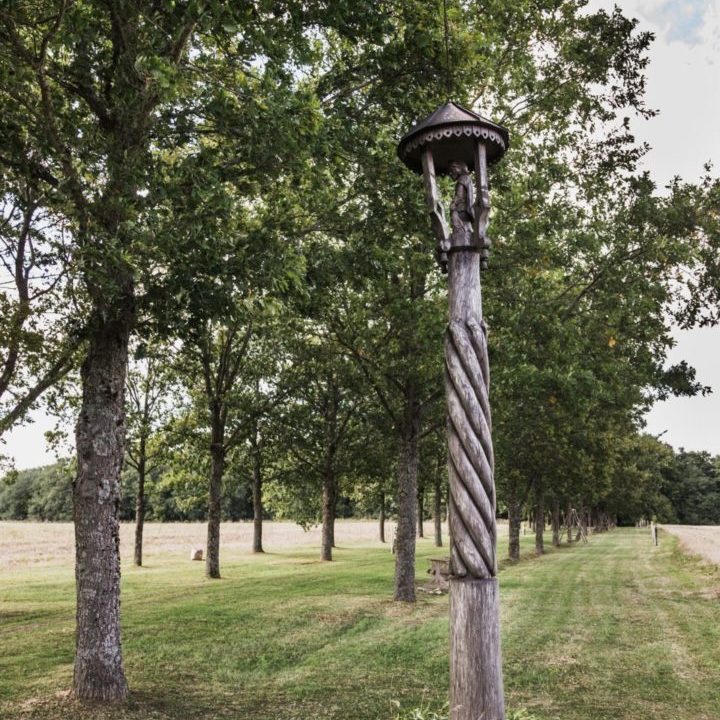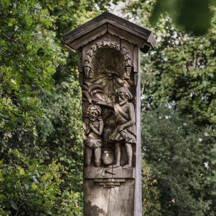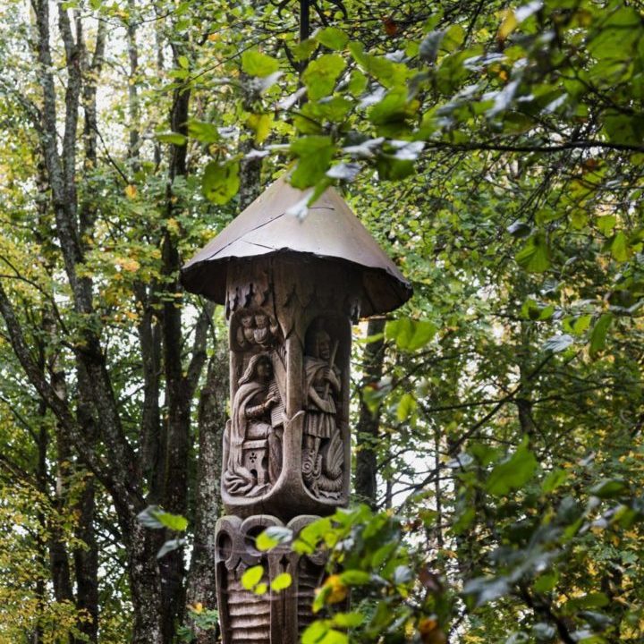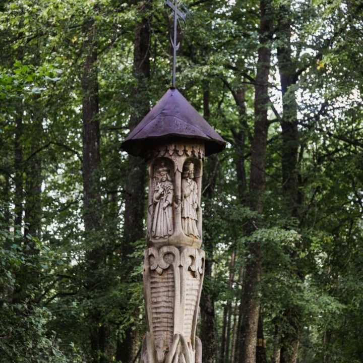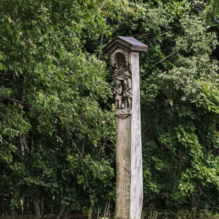 At the end of the oak tree alley, near the Sandrava rivulet, there is a pillar-type chapel for St. John the Baptist by Lithuanian godmaker Jonas Grabauskas. In Christian tradition, John the Baptist stood on the threshold between the Old and the New Testament and was the last prophet in the sense of the Old Testament. After a period of desert solitude, John the Baptist emerged as a prophet in the region of the lower Jordan River valley. The plot of the bas-relief tells the Gospel story of St. John baptizing Jesus, and as soon as Jesus was baptized, he saw the Spirit of God descending like a dove and alighting on him.