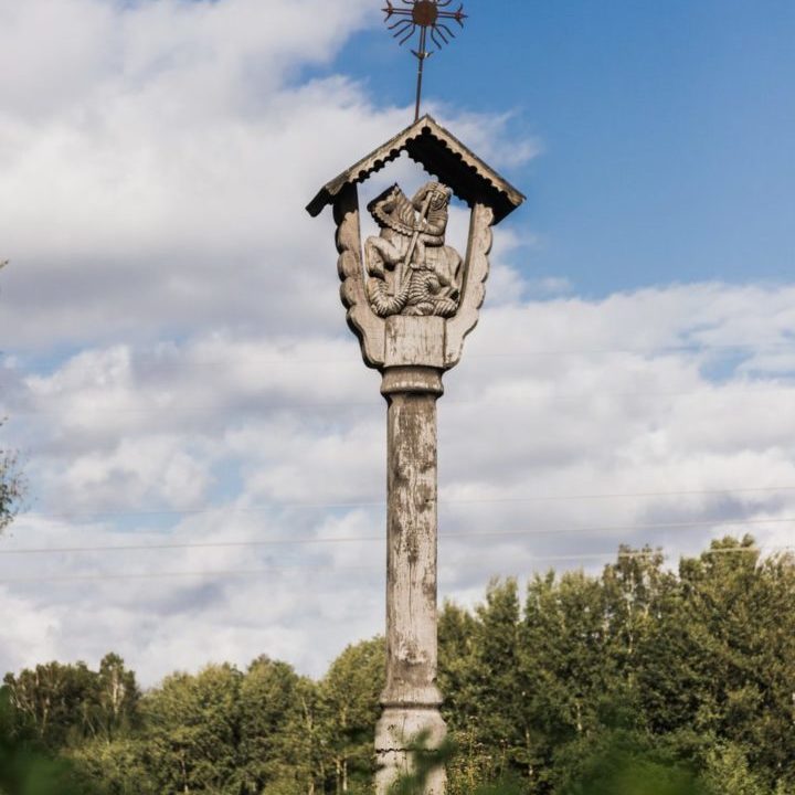A pillar-type chapel for St. George (author A. Česnulis) shows visitors the way from the Sandrava valley to Pasandravys manor. In Lithuania, Saint George is the second most important patron saint, after Saint Casimir, and he is also the patron saint of farmers, soldiers, and scouts. Saint George is depicted riding a horse, often spearing a dragon, a symbol of good winning over evil.