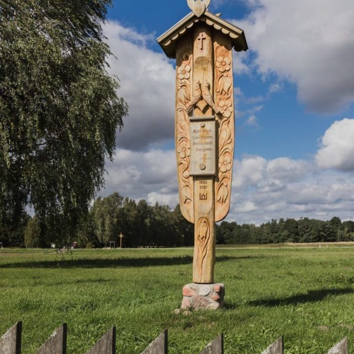 Even three crosses protect Maironis native place. The cross that greets visitors to Maironis native place was carved by a woodworker Jonas Malinauskas as far back as 1989. The second cross created by Juozas Binkis was erected near the path to Pasandravis. The rest of those entombed in the small graveyard is preserved by the cross made by a woodworker Algirdas Baranauskas. These crosses arrived at Maironis native place together with other pillar-type chapels in 1991.